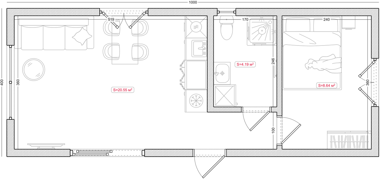 • Holzkonstruktion, OSB-Platte 10 mm, Außenwände mit Mineralwolle 15 cm, Membran (Winddichtung) sowie Dampfsperrfolie• Verkleidung der Innenwände mit OSB-Platte• Verkleidung der Badezimmerwände mit OSB-Platte