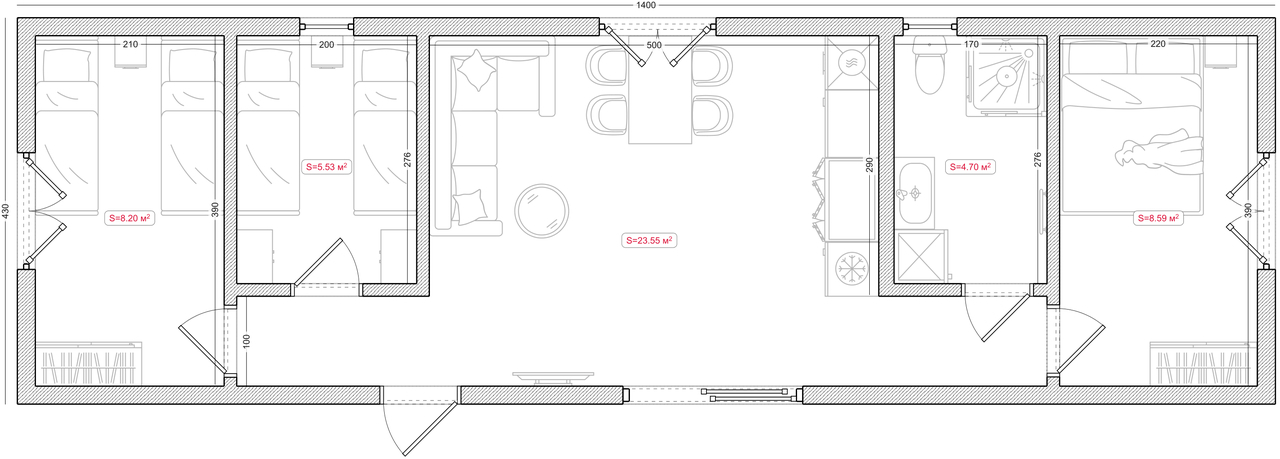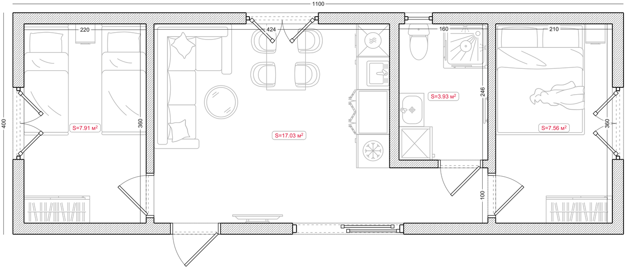 • Stahlrahmenkonstruktion mit imprägnierten Holzelementen, korrosionsgeschützt, ausgeführt auf Basis eines statischen Projekts. Mobile Version (mit Rädern, von 4 bis 8 Rädern, optional mit Lenkachse) oder Flat Floor (flacher Boden). Unterseite des Hauses mit Blech gesichert. Standard-Raumhöhe innen: 250 cm.