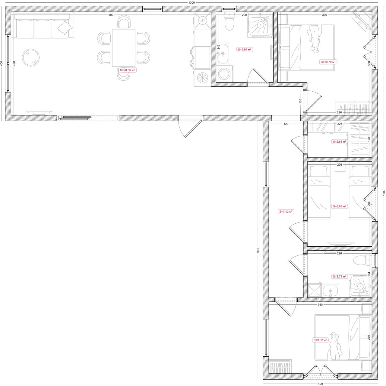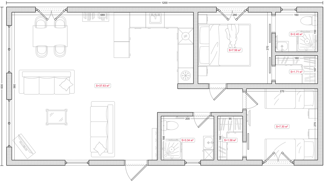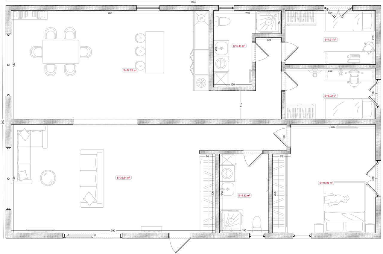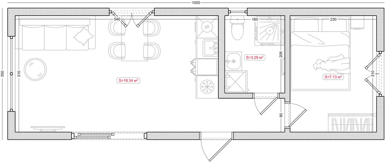 • Houten constructie, OSB-plaat 10 mm, buitenwanden met Minerale wol 15 cm, membraan (winddichting) en dampremmende folie • Bekleding van de binnenwanden met OSB-plaat • Bekleding van de badkamerwanden met OSB-plaat