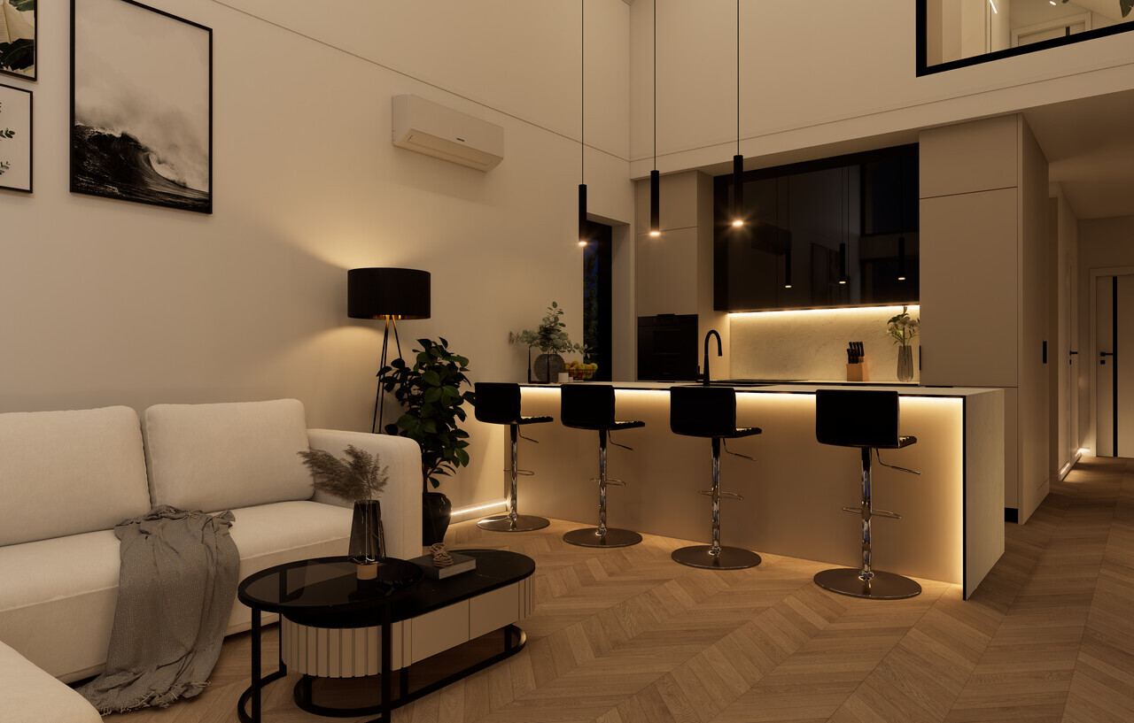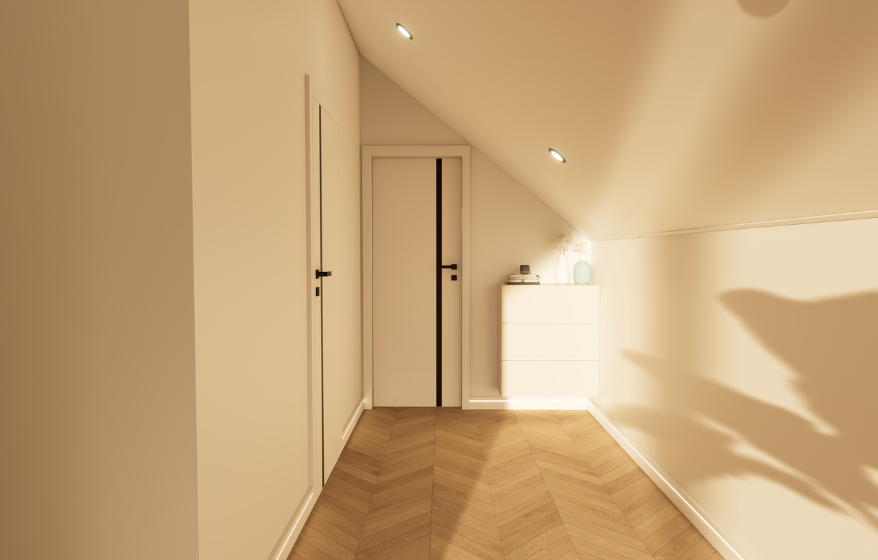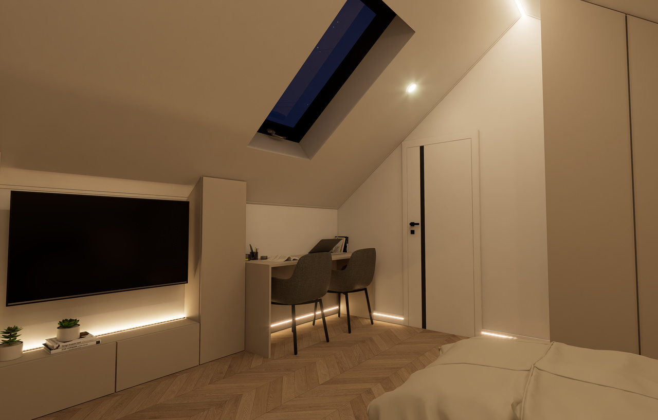 W obszarze oświetlenia Dom Mobilny został zaprojektowany z myślą o nowoczesnych rozwiązaniach. W każdym pomieszczeniu można znaleźć oświetlenie punktowe LED oraz liniowe oświetlenie LED w suficie. Dla tych, którzy cenią sobie estetykę również na zewnątrz, dostępne są kinkiety i profile LED, które doświetlają przestrzeń na zewnątrz.