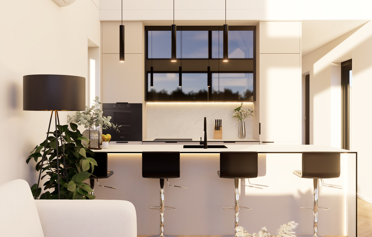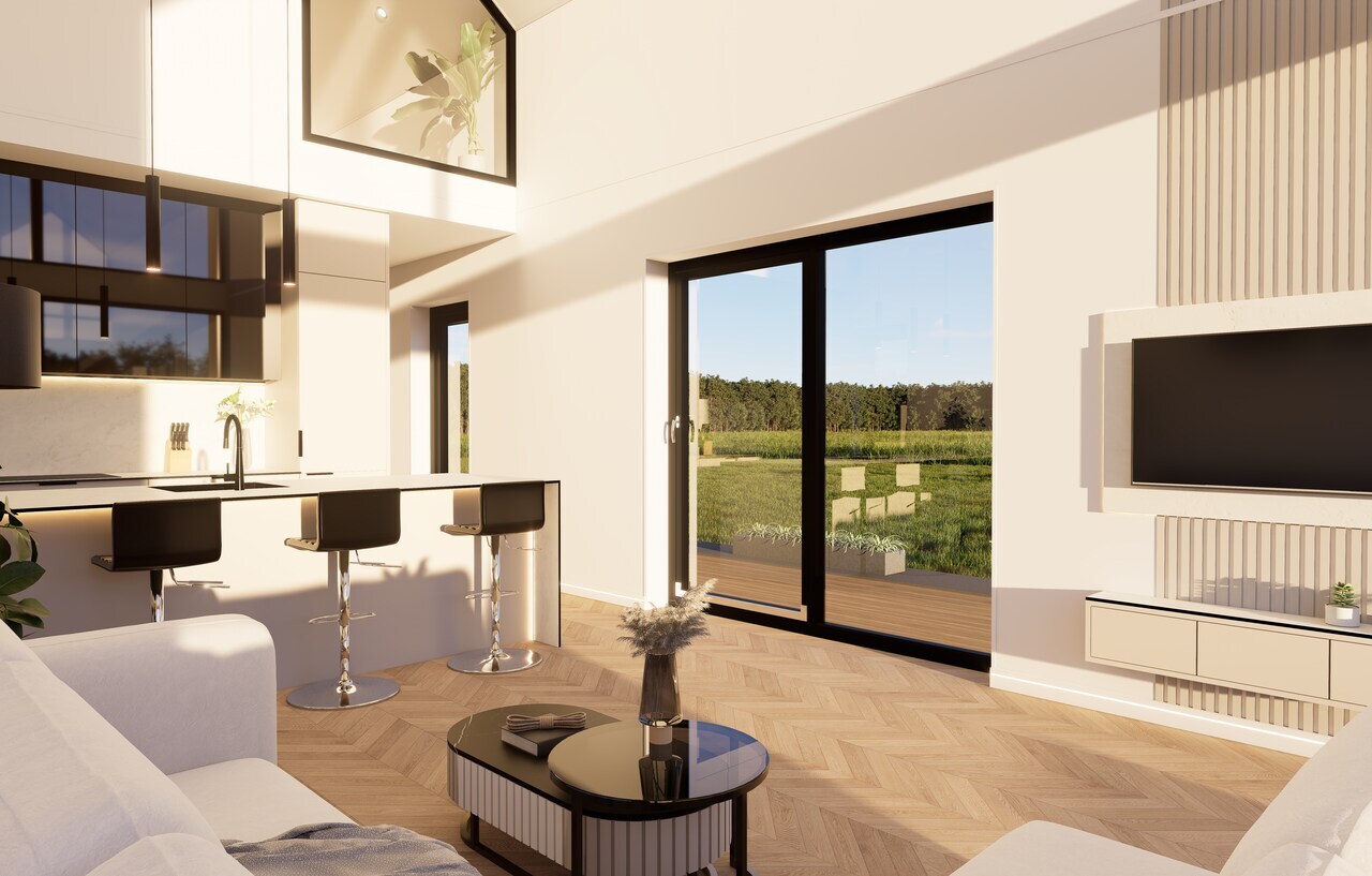 Okna w tym modelu, z pakietem 3-szybowym i czarną okleiną na zewnątrz, oferują dużą przestrzeń przeszkloną, co wpuszcza dużo naturalnego światła. Okno tarasowe przesuwne dodatkowo podkreśla walory estetyczne i funkcjonalność przestrzeni.
