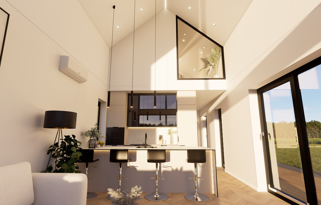 Kuchnia w tym Domu Mobilnym jest wykonana na wymiar, z zabudową skośną do sufitu. Wyposażenie obejmuje umywalkę, piekarnik, wysoką lodówkę oraz okap kuchenny. Dodatkowo, dostępna jest wyspa kuchenna z blatem i krzesłami barowymi, co czyni ją idealnym miejscem do codziennych posiłków. Drzwi wewnętrzne z regulowaną ościeżnicą dodają elastyczności aranżacyjnej.