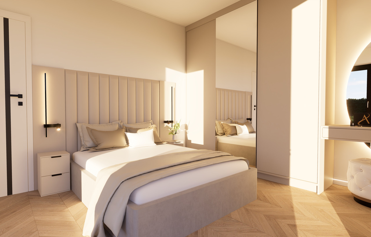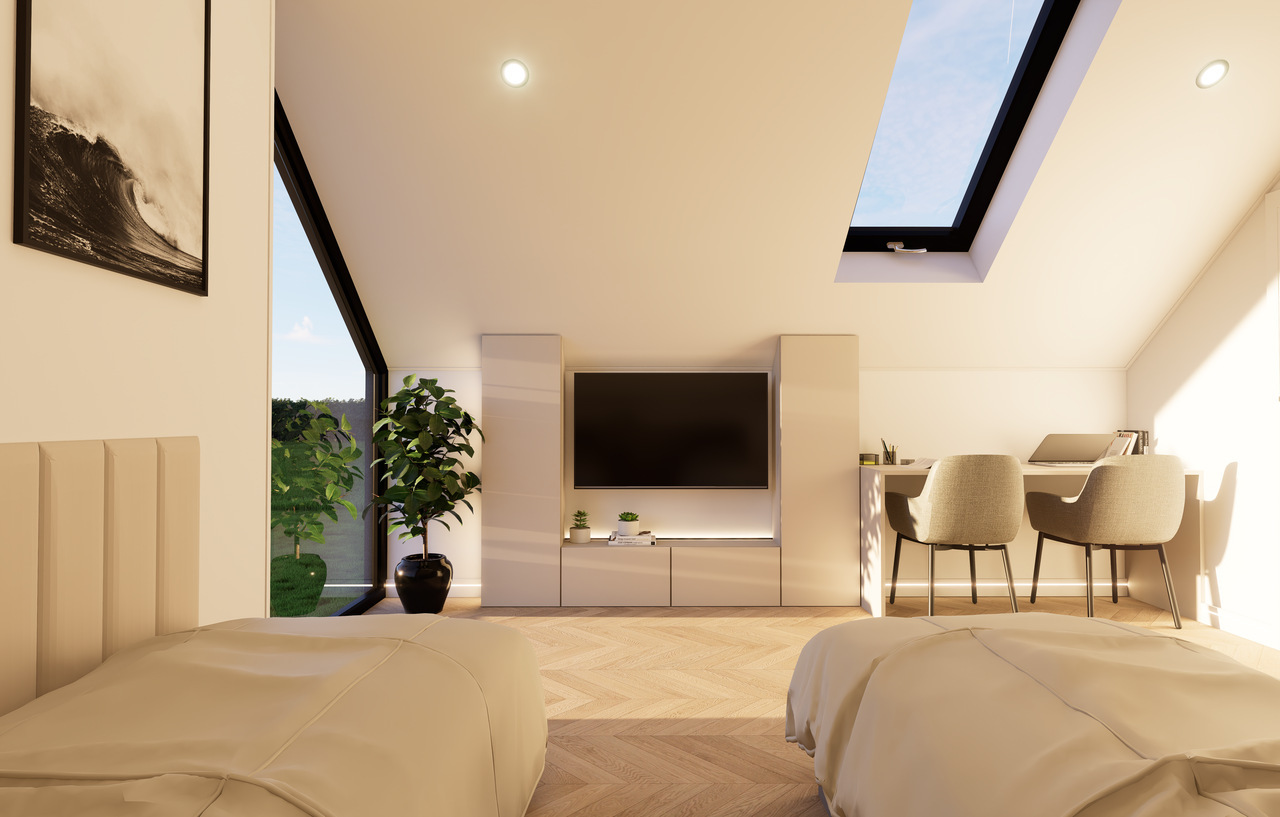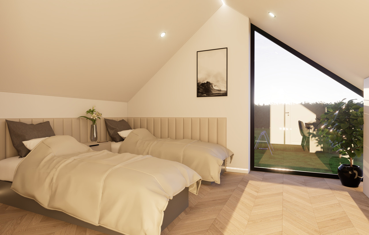 Wnętrze Domu Mobilnego to połączenie funkcjonalności z komfortem. Obejmuje on dwie przestronne sypialnie, łazienkę oraz salon z aneksem kuchennym. Ściany i sufit wykończone są eleganckimi panelami Forestia, a w łazience zastosowano panele ścienne SPC. Na podłodze znajduje się panel winylowy, który jest zarówno estetyczny, jak i praktyczny. W dużej sypialni znajduje się podwójne łóżko (160x200) oraz szafki nocne i szafa ubraniowa, podczas gdy w mniejszej sypialni umieszczono dwa łóżka (70x200) oraz dwie szafy wiszące.