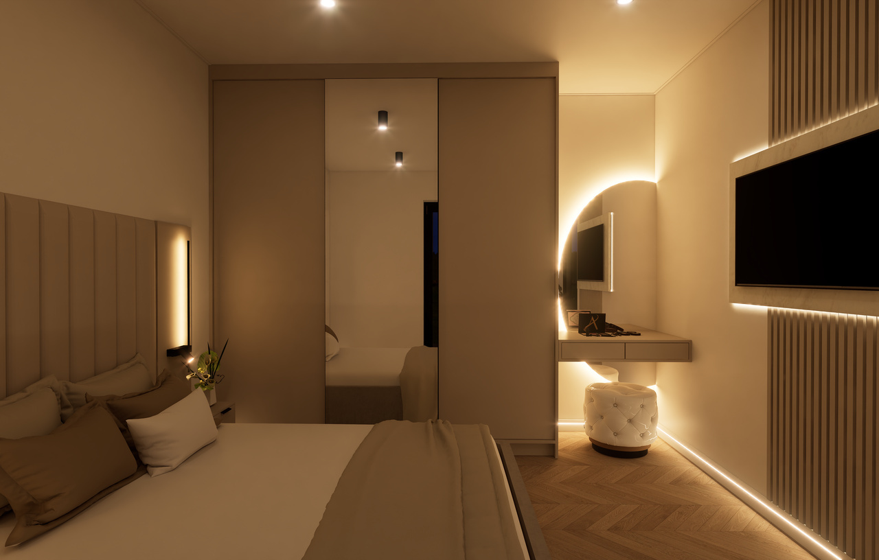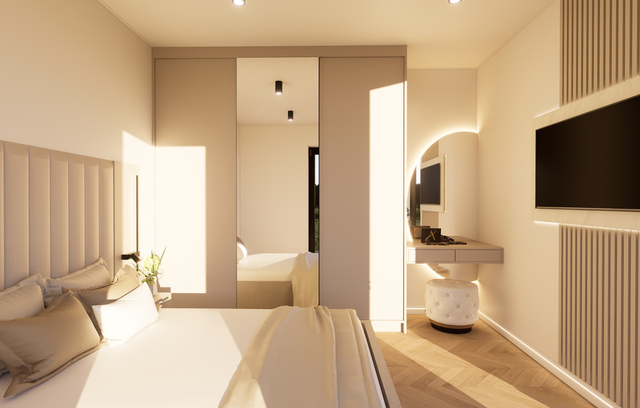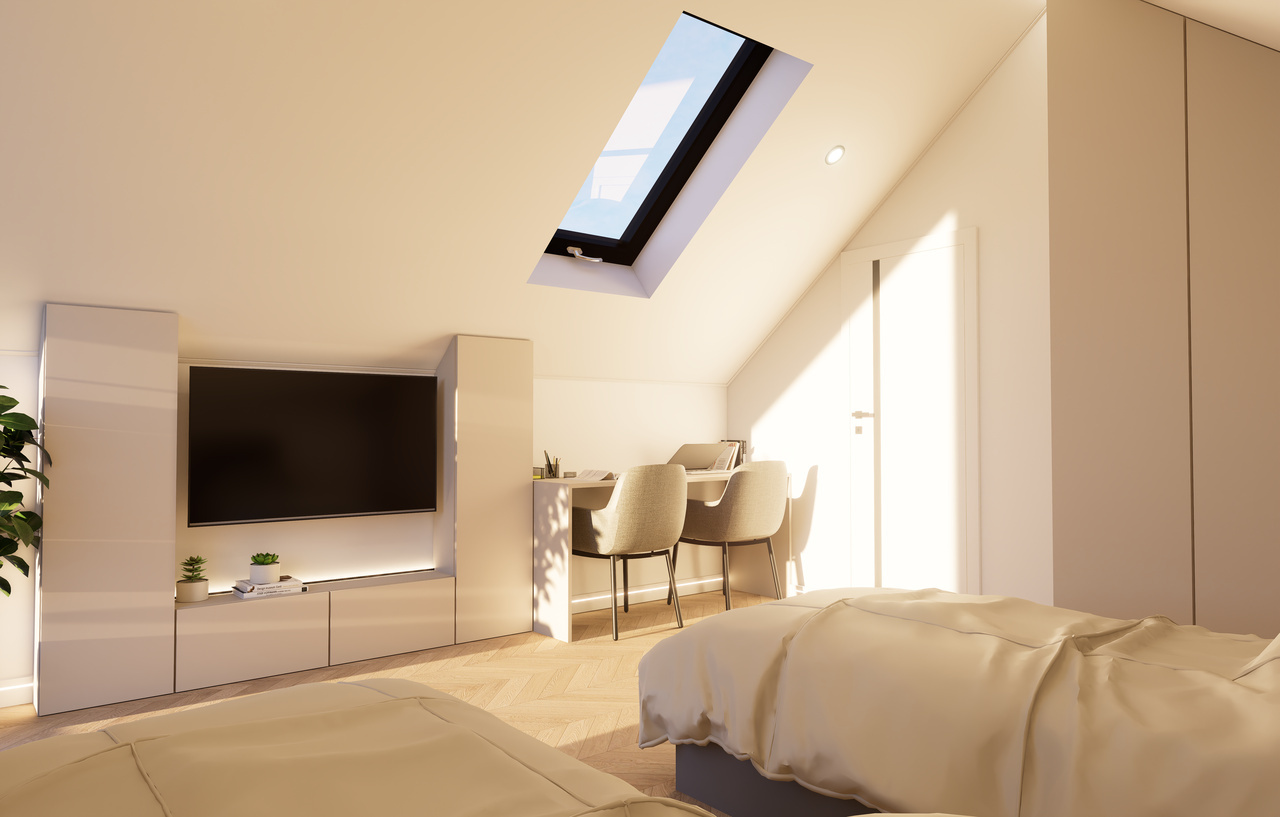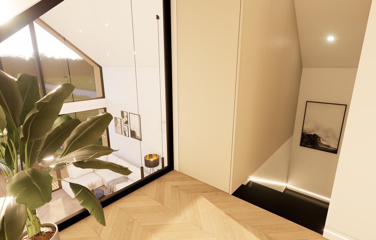 Wnętrze Domu Mobilnego to połączenie funkcjonalności z komfortem. Obejmuje on dwie przestronne sypialnie, łazienkę oraz salon z aneksem kuchennym. Ściany i sufit wykończone są eleganckimi panelami Forestia, a w łazience zastosowano panele ścienne SPC. Na podłodze znajduje się panel winylowy, który jest zarówno estetyczny, jak i praktyczny. W dużej sypialni znajduje się podwójne łóżko (160x200) oraz szafki nocne i szafa ubraniowa, podczas gdy w mniejszej sypialni umieszczono dwa łóżka (70x200) oraz dwie szafy wiszące.