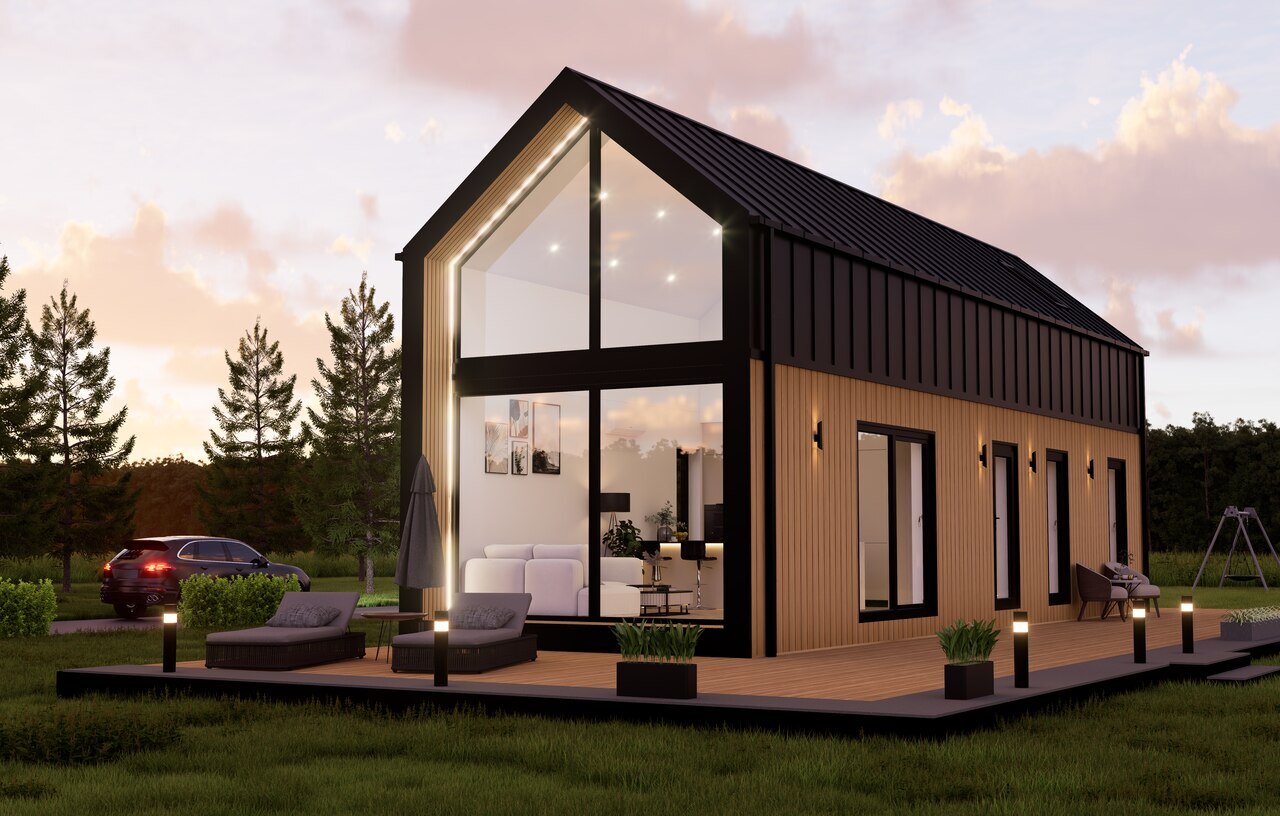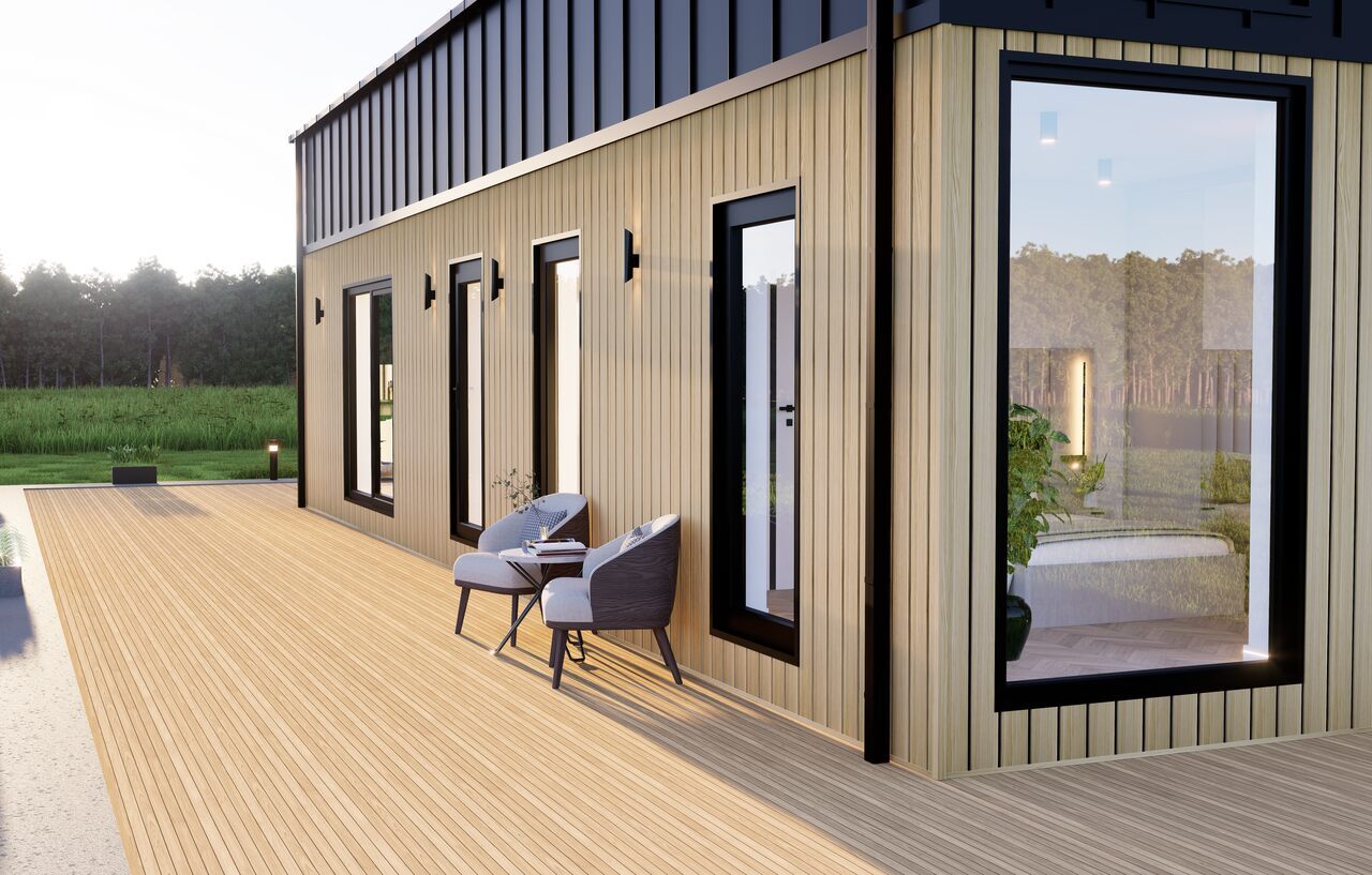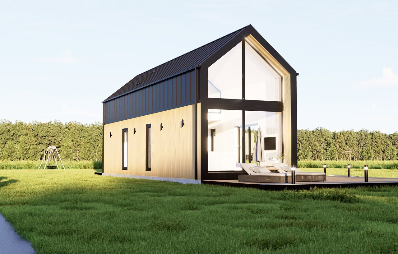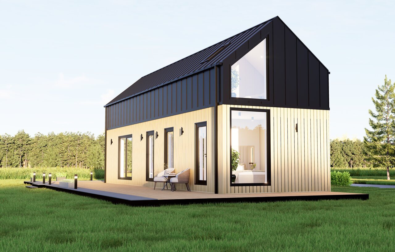 Elewacja Domu Mobilnego to estetyka i trwałość. Ściany wykończone są niemieckim panelem Vinylit w dwóch odcieniach, a dach pokryty panelem "na rąbek". Tarasowy wypust akcentowany jest deską, a obróbki dachowe i ścienne wykonane są według sztuki dekarskiej. Orynnowanie kwadratowe premium dopełnia estetykę całej konstrukcji.